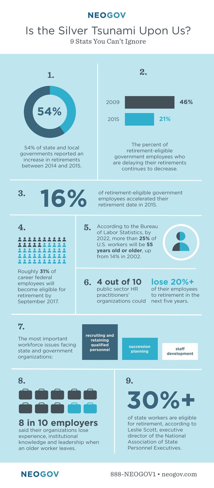 The most important takeaway for all HR agencies is that if you haven’t begun thinking about how your organization will deal with the silver tsunami, start today. And if you’ve already begun recruiting new workers or succession planning, ramp up your efforts and ensure that key pieces of knowledge are being transferred before a Boomer’s last day on the job.